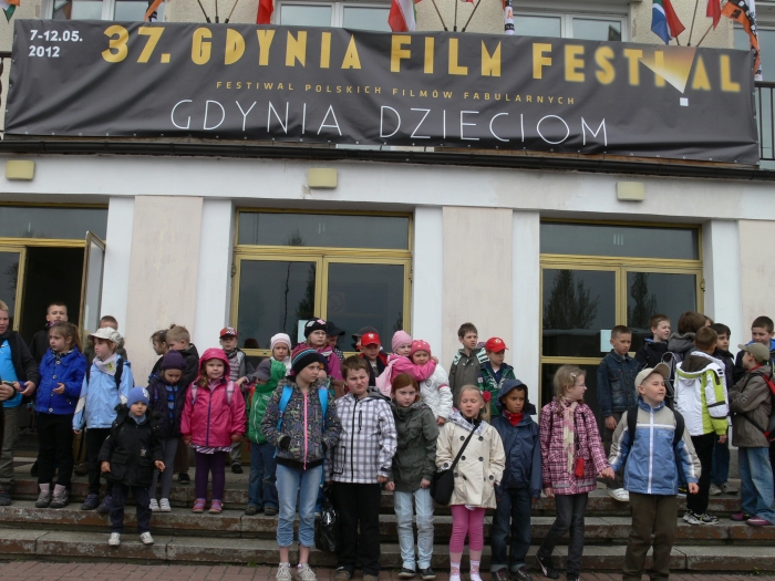 07 maja uczniowie klas 0-III na zaproszenie Stowarzyszenia Filmowców Polskich oraz Pomorskiej Fundacji Filmowej, gościli w kinoteatrze GROM w Gdyni Oksywie, na Przeglądzie Filmów Animowanych dla Dzieci - GDYNIA DZIECIOM.
