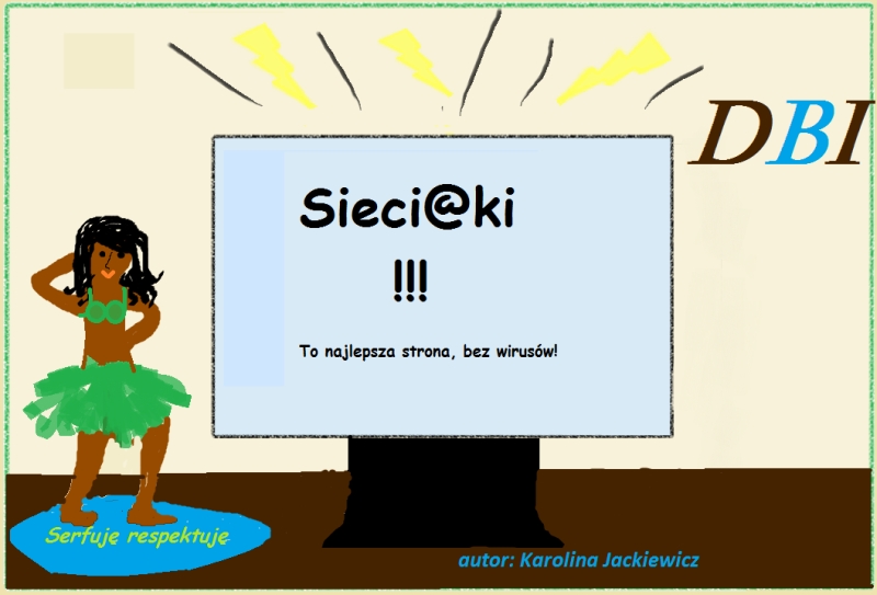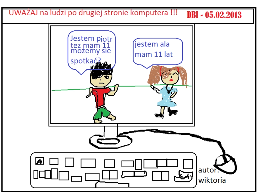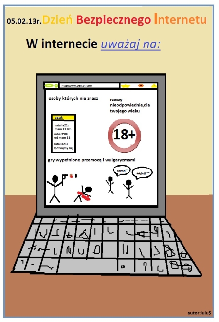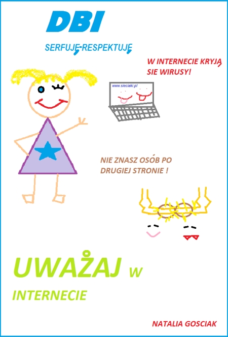 Na zajęciach w szkolnej pracowni komputerowej wszyscy uczniowie uczestniczyli w pogadankach na temat Internetu i oglądali prezentacje o bezpieczeństwie w sieci. Uczniowie z klasy VI wykonali plakaty, które rozwiesili na tablicach szkolnych. Kilka z nich prezentujemy poniżej: