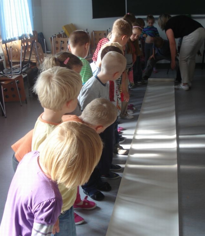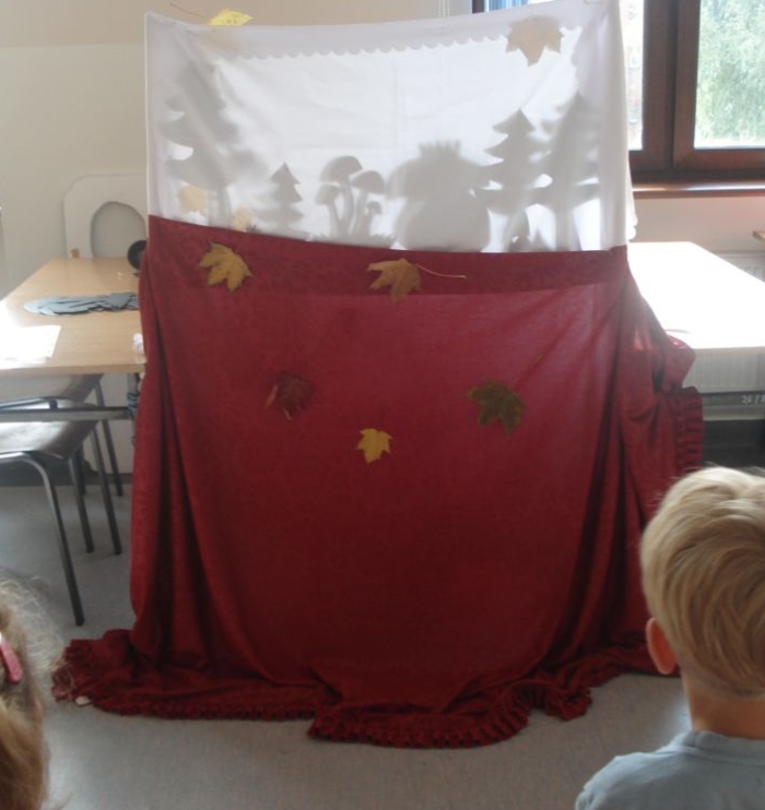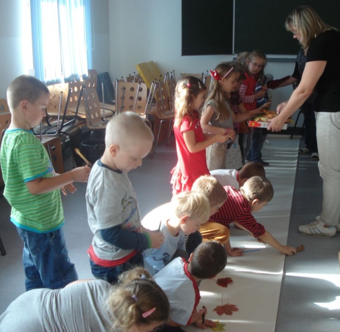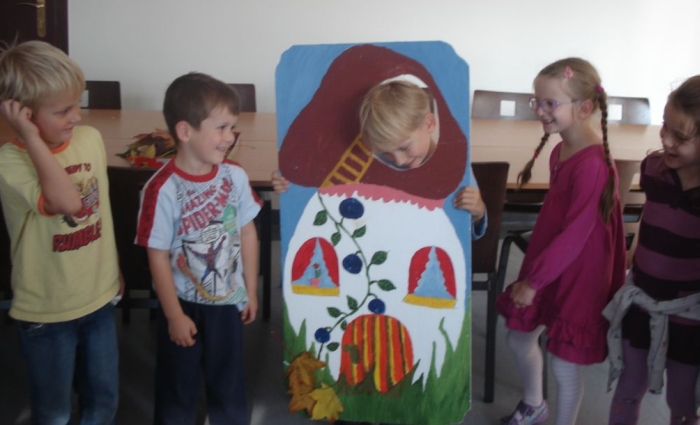 Dzieci oglądały z zaciekawieniem teatrzyk cieni, wspólnie stworzyły z liści pracę plastyczną pt. Jesienna gąsienica, uczyły się pląsów, rysowały i wycinały krasnoludki oraz same wchodziły w role skrzatów. Na pamiątkę zabrały ze sobą upominek wykonany z darów jesieni.