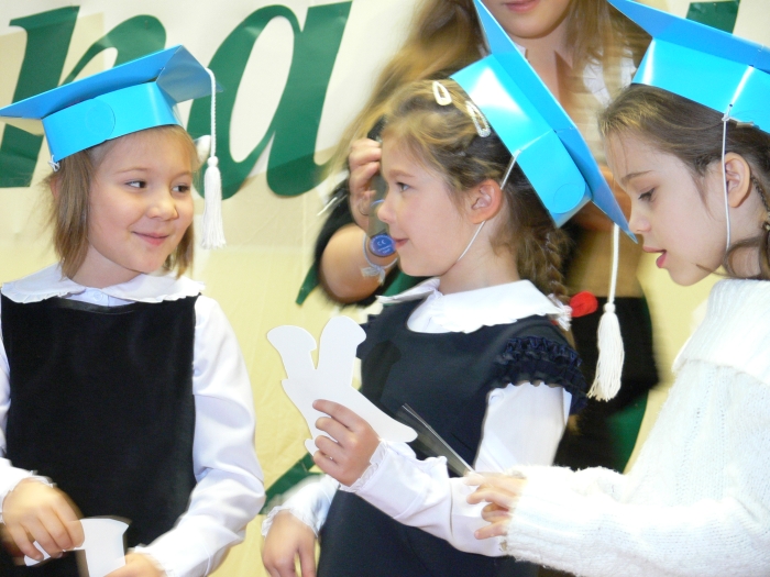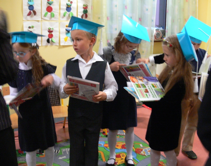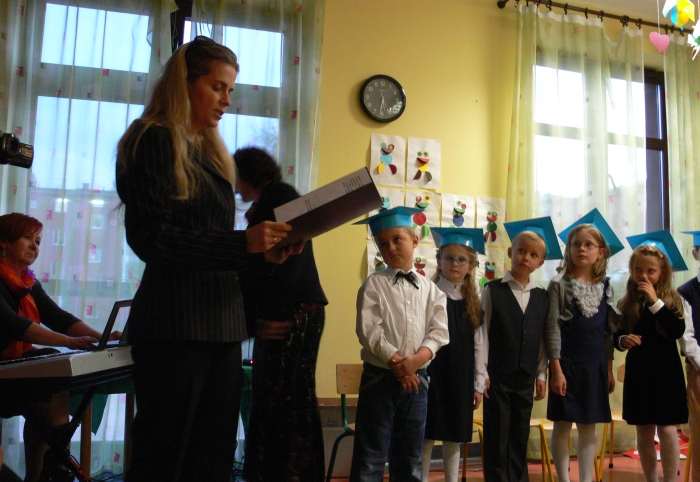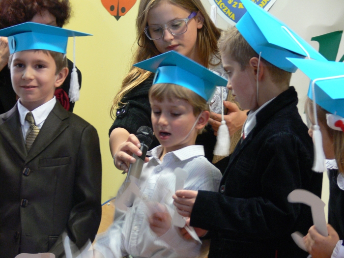Na zakończenie oficjalnej części uroczystości nowo przyjęci w poczet społeczności szkolnej uczniowie otrzymali dyplomy, książki, tuby ze słodyczami, zakładki do książek wykonane przez kolegów z kl. III i V oraz bardzo ważny dokument: legitymację szkolną.