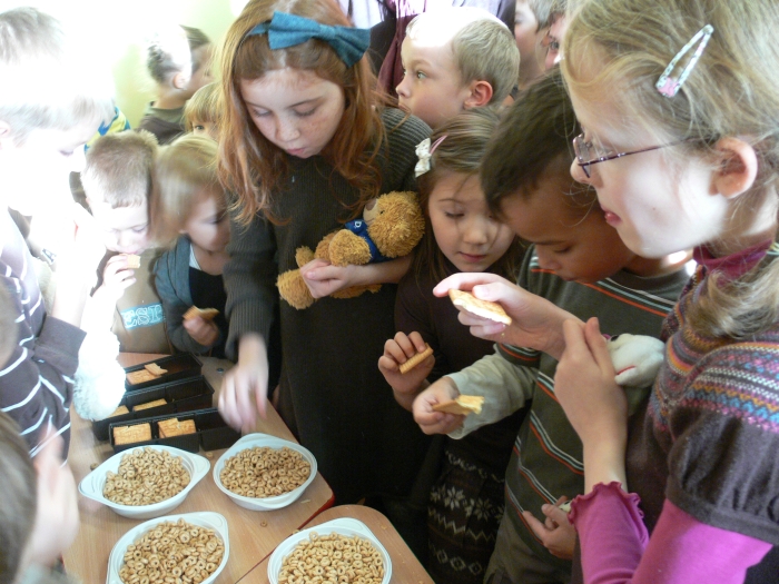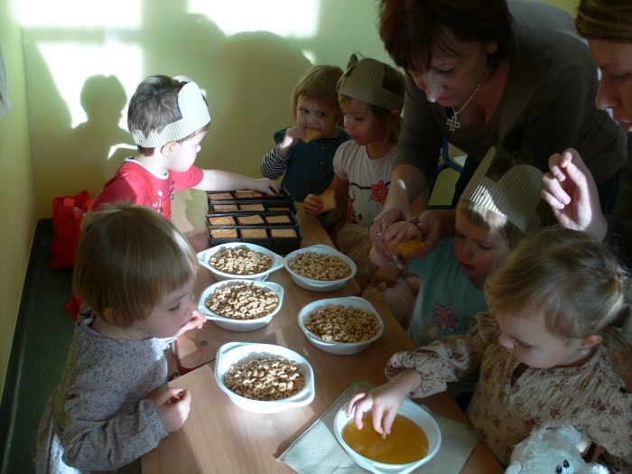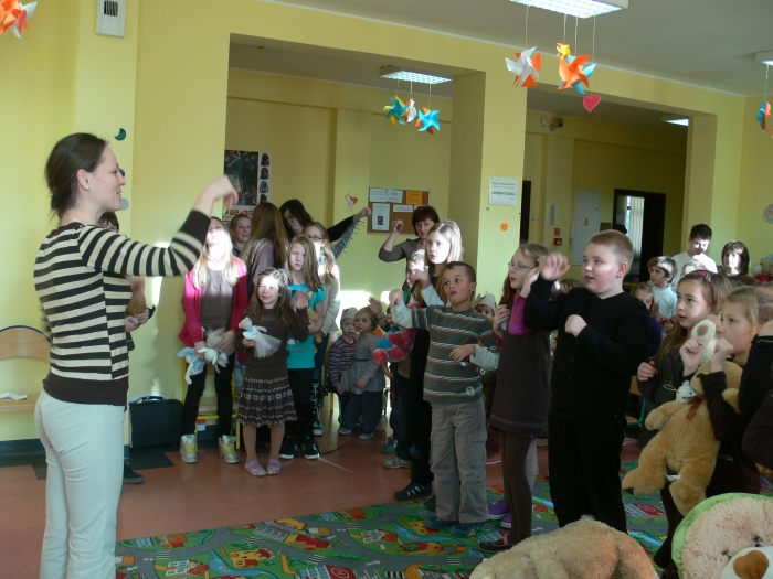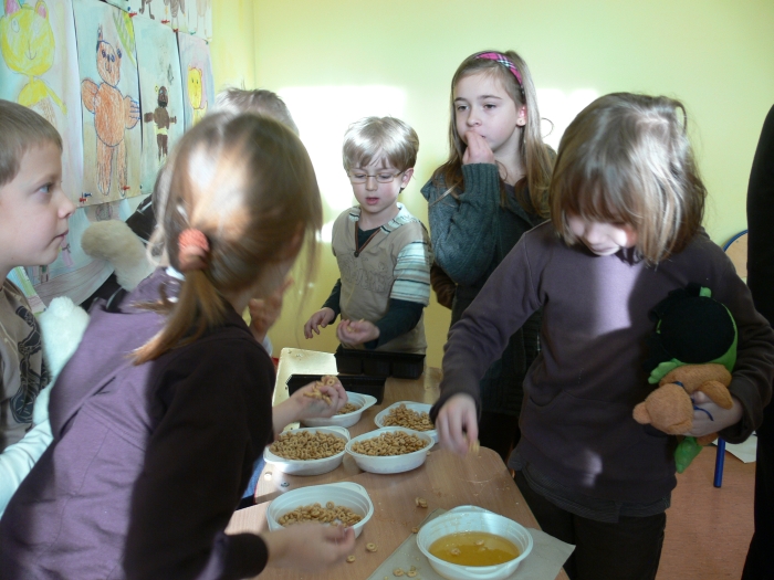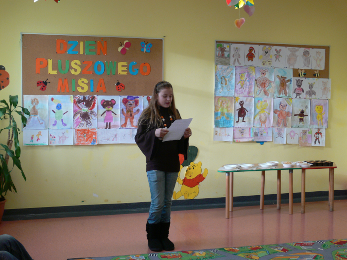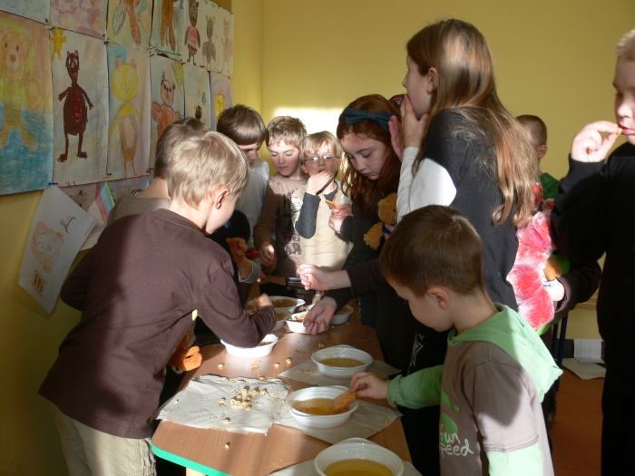 Uczniowie słuchali bajki o najbardziej znanym misiu - Kubusiu Puchatku. Wraz z p. Izą, nauczycielem muzyki, zaśpiewali "misiową" piosenkę.Dużym zaintetesowaniem cieszyło sie miejsce, gdzie można było spróbować miodowych przysmaków: miodu, ciastek i chrupek miodowych.