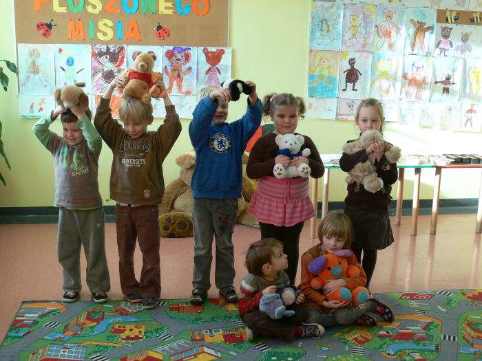 W Światowym Dniu Pluszowego Misia dzieci przyniosły do szkoóły masktki, a niektórzy przebrali sie za misie. Spośród ogromnej ilości przyniesionych pluszaków udało sie znaleźć najmniejszego, który należał do Irenki z grupy 3-latków. Właścicielem największego misia okazał sie Nikodem z grupy 4-latków. .