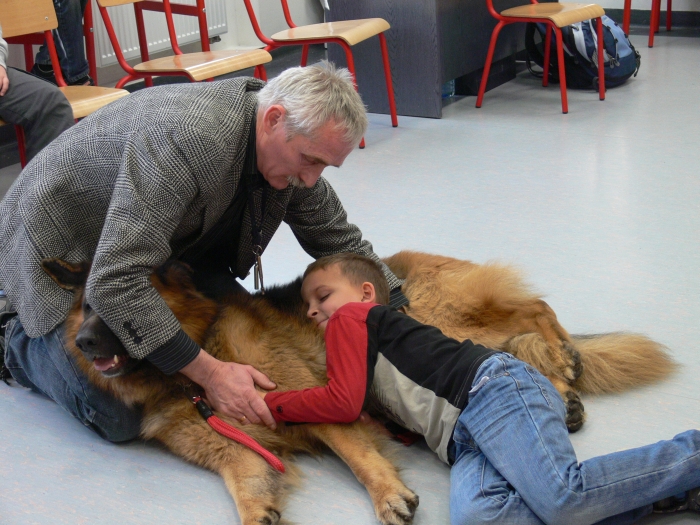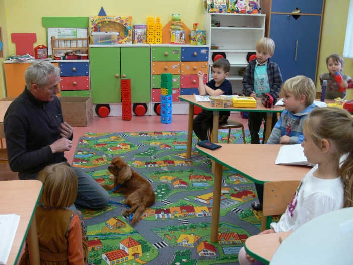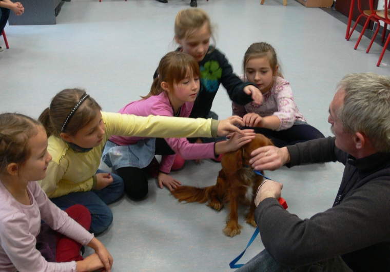 Pan Leszek, opiekun SANTO, przedstawił siebie i psa, a chwile później nadszedł długo wyczekiwany moment przywitania się uczniów z psem. Dzieci chętnie głaskały psa, podawały mu smakołyki, rzucały zabawkę. Coraz więcej dzieci z grupy przekonywało się, że nie trzeba się SANTA bać. Wszyscy odważni zdecydowali się położyć głowę na boku psa i ręką wysłuchiwali bicia jego serca.
