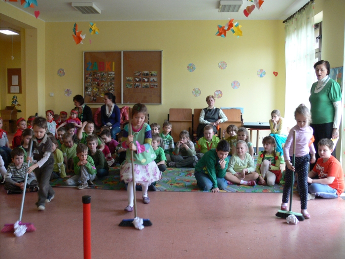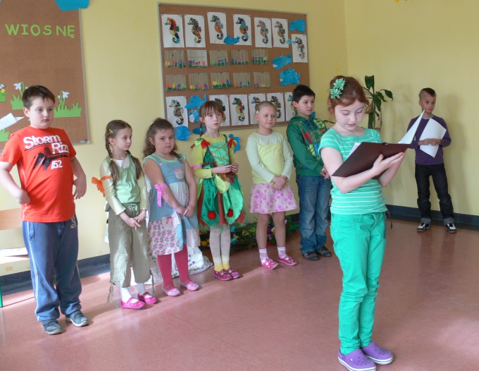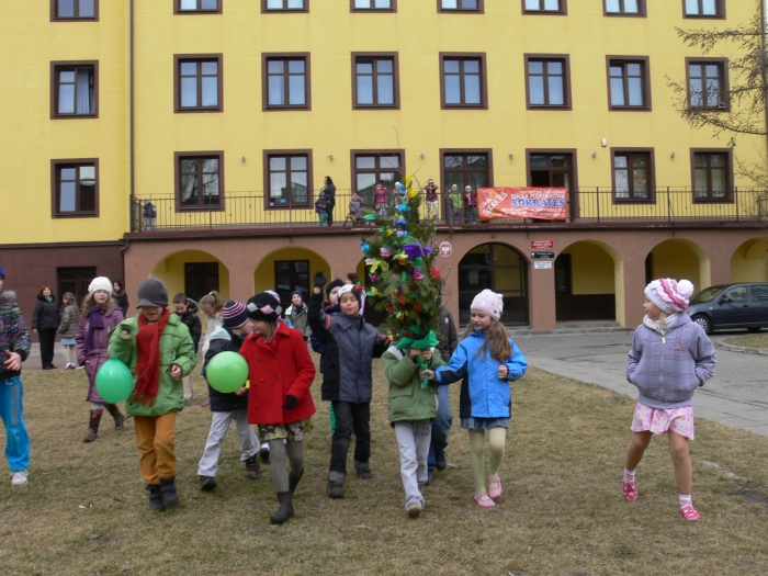 W tym roku Dzień Wiosny organizowała klasa 3, pod kierunkiem wychowawczyni. Do wspólnej zabawy zaprosili swoje młodsze koleżanki i kolegów z klas 0-2. Tydzień wcześniej każda klasa dostała zadanie do wykonania. I tak: klas "0" - zrobiła krokusy, klasa I - gaik zielony, a klasa II - kukłę Marzanny, którą wspólnie ubieraliśmy.