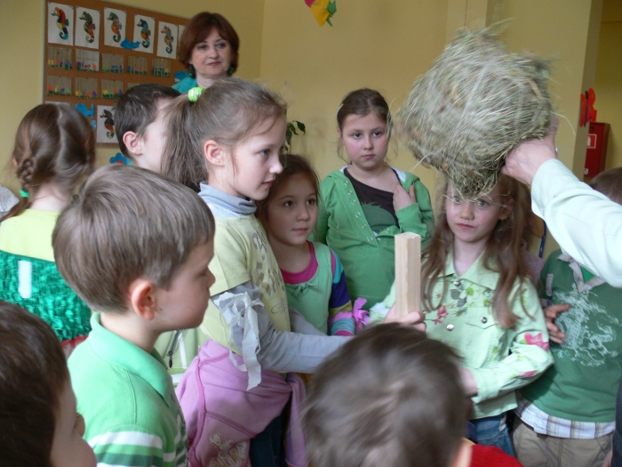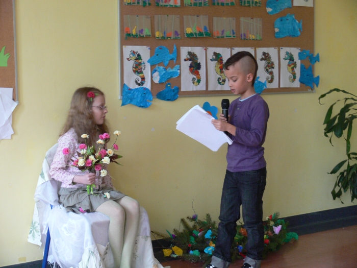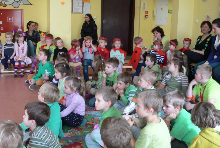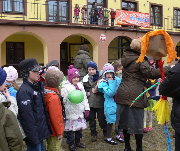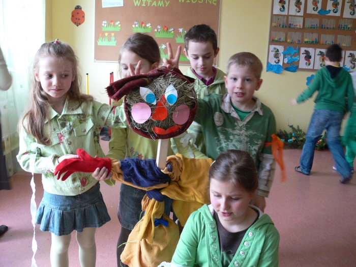 Natalka zagrała "Powitalny koncert" i wspólnie z przedstawicielami poszczególnych klas recytowaliśmy wiersze na powitanie wiosny. No i nareszcie przyszła do nas długo oczekiwana WIOSNA. Oczywiście, zgodnie z tradycją żegnaliśmy ZIMĘ z piosenką na ustach, ale już sposób jej topienia, był bardzo niekonwencjonalny.