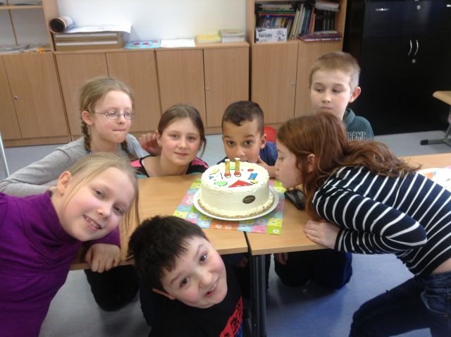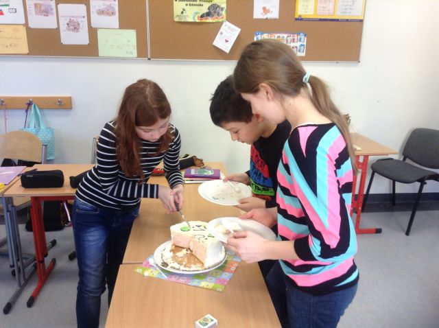 Dnia 28 lutego uczniowie klasy czwartej wraz z paniami: Danutą Kwiatkowską i Agnieszką Majewską uczcili swoją 100-tną lekcję matematyki tortem śmietankowo-truskawkowym. Z niecierpliwością wszyscy czekali na tę szczególną lekcję i odliczali do niej dni.