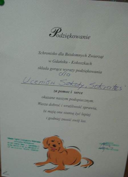 Uczniowie naszj Szkoły bardzo licznie i chętnie włączyli sie do akcji zbierania darów dla bezdomnych zwierząt ze Schroniska dla Bezdomnych Zwierząt w Gdańskuu-Kokoszkach. Szkoła SOKRATES ze Schroniskiem współpracuje już kolejny rok. W ubiegłym roku szk. nasi aktorzy występowali w tymże Schronisku w ramach konkursu teatrzyków szkolnych, gdzie zaprezentowali musical "Kocia Babuleńka" w reżyserii p. Urszulu Kuffel-Otlewskiej i zajeli I miejsce.
