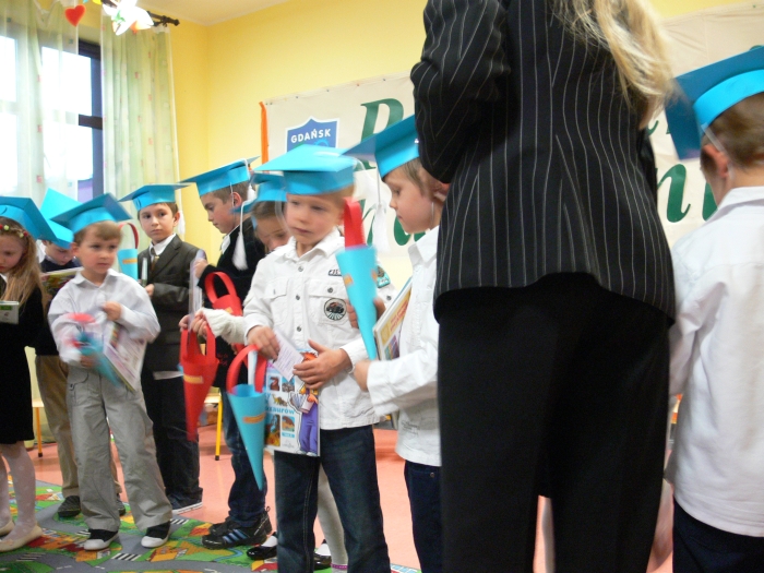 Na zakończenie oficjalnej części uroczystości nowo przyjęci w poczet społeczności szkolnej uczniowie otrzymali dyplomy, książki, tuby ze słodyczami, zakładki do książek wykonane przez kolegów z kl. III i V oraz bardzo ważny dokument: legitymację szkolną.