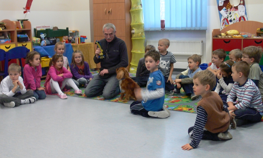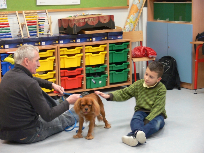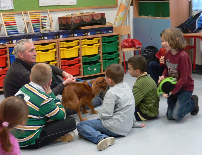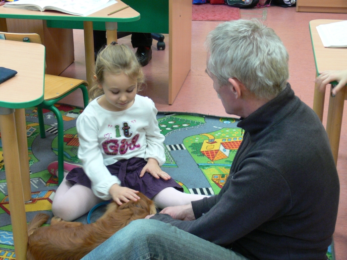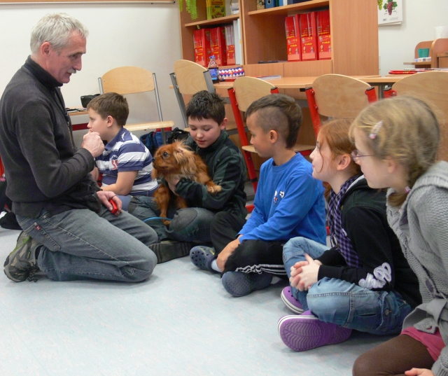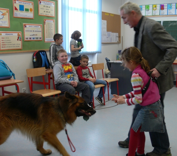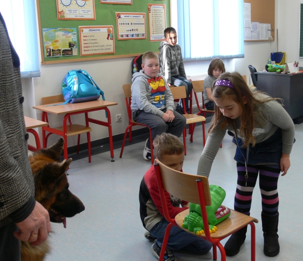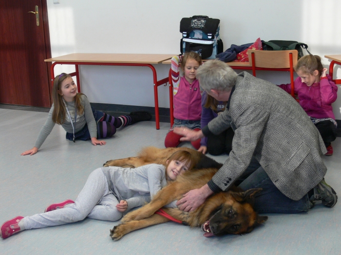 Pan Leszek, opiekun SANTO, przedstawił siebie i psa, a chwile później nadszedł długo wyczekiwany moment przywitania się uczniów z psem. Dzieci chętnie głaskały psa, podawały mu smakołyki, rzucały zabawkę. Coraz więcej dzieci z grupy przekonywało się, że nie trzeba się SANTA bać. Wszyscy odważni zdecydowali się położyć głowę na boku psa i ręką wysłuchiwali bicia jego serca.