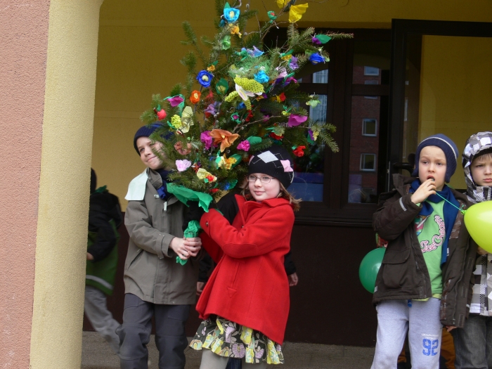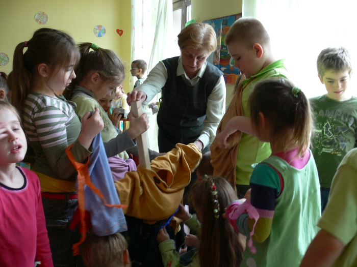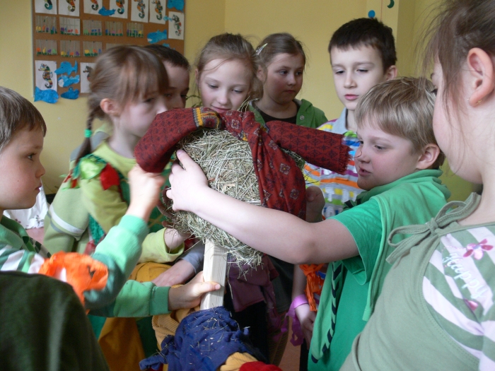 W tym roku Dzień Wiosny organizowała klasa 3, pod kierunkiem wychowawczyni. Do wspólnej zabawy zaprosili swoje młodsze koleżanki i kolegów z klas 0-2. Tydzień wcześniej każda klasa dostała zadanie do wykonania. I tak: klas "0" - zrobiła krokusy, klasa I - gaik zielony, a klasa II - kukłę Marzanny, którą wspólnie ubieraliśmy.