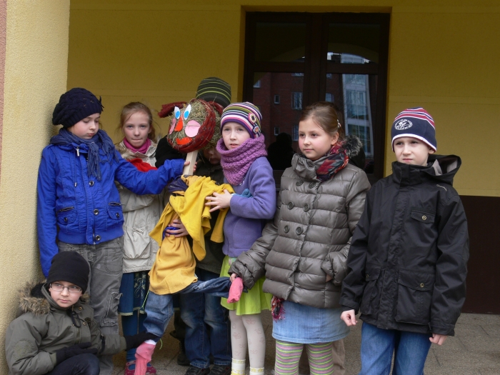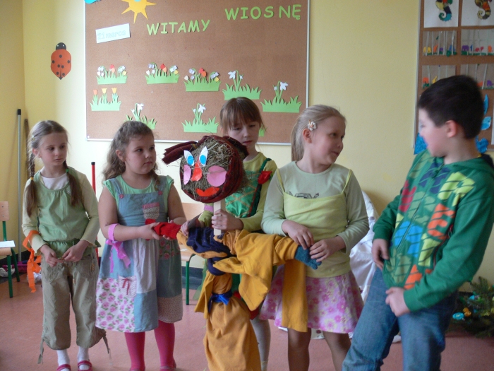 Natalka zagrała "Powitalny koncert" i wspólnie z przedstawicielami poszczególnych klas recytowaliśmy wiersze na powitanie wiosny. No i nareszcie przyszła do nas długo oczekiwana WIOSNA. Oczywiście, zgodnie z tradycją żegnaliśmy ZIMĘ z piosenką na ustach, ale już sposób jej topienia, był bardzo niekonwencjonalny.